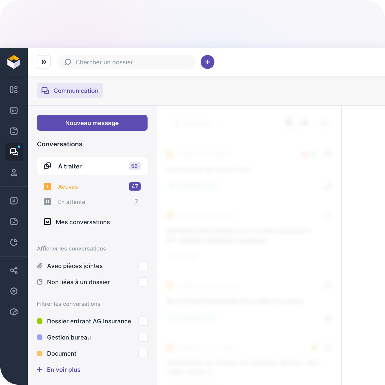 Communications, qui vous permet de consulter l'intégralité des conversations qui vous sont assignées, tous dossiers confondus. - Dans un dossier, en sélectionnant l'onglet