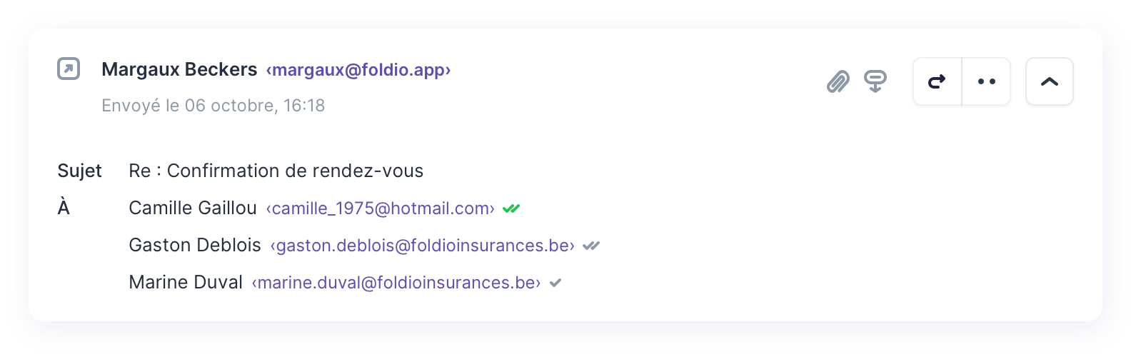 Grâce à des indicateurs visuels distincts, vous pouvez identifier facilement l'état de réception de vos e-mails envoyés dans votre conversation :