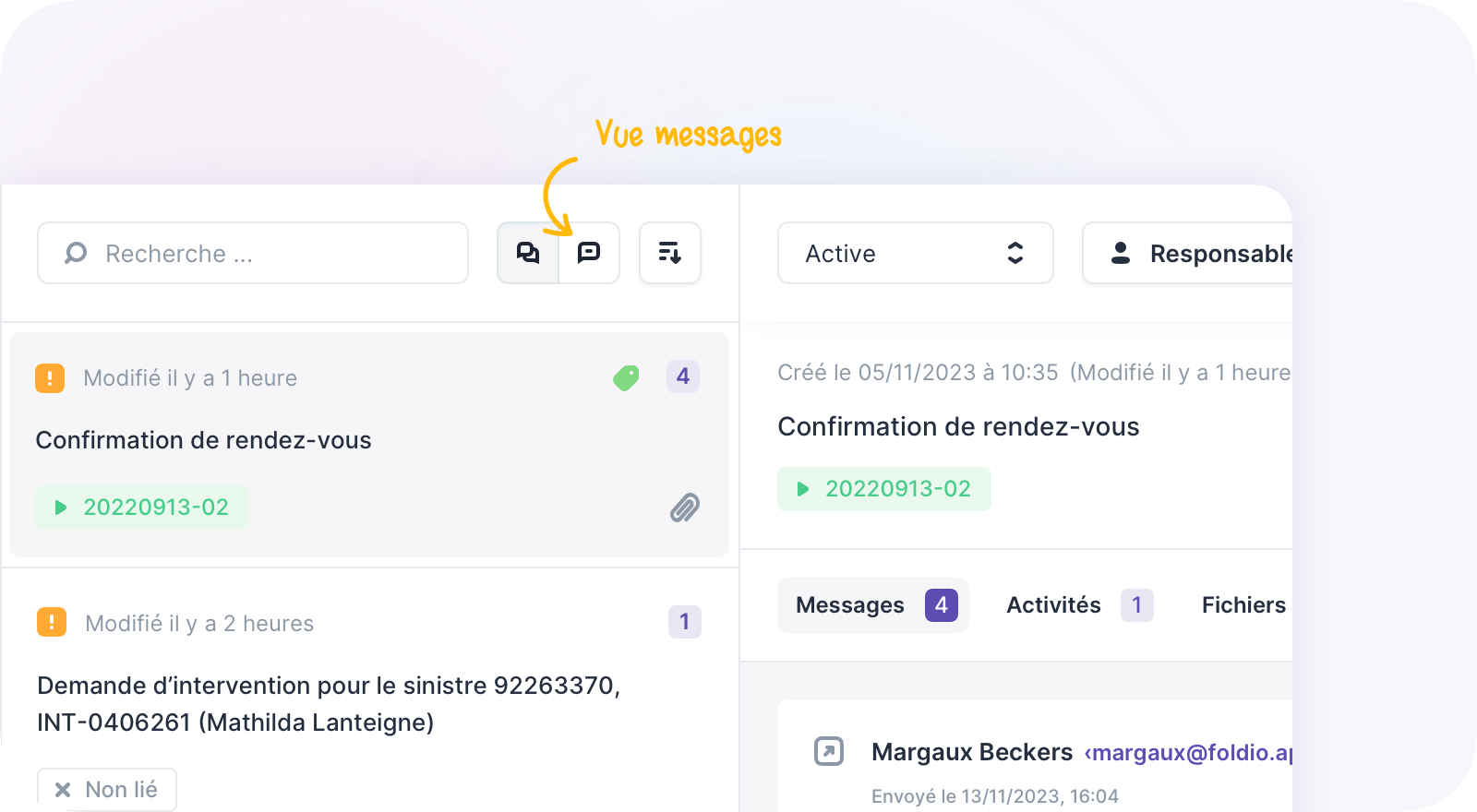 Foldio privilégie une vue par "Conversation" mais il vous également est possible de lister la totalité des messages reçus et envoyés au travers de la vue "Message". Lorsque vous sélectionnez un message de cette liste, vous êtes automatiquement redirigé vers celui-ci dans le flux de la conversation.